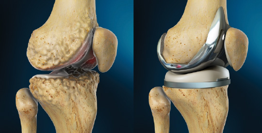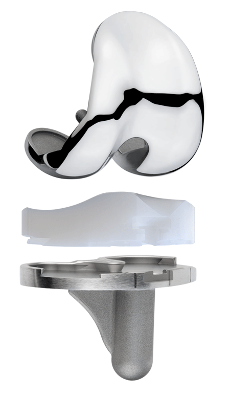 L’indicazione all’intervento è data dal grado avanzato di usura articolare. L’intervento consiste nel rivestimento delle superfici articolari del femore e della tibia con componenti in metallo (cromo-cobalto-molibdeno) che vengono accoppiate grazie ad un menisco in polietilene che permette lo scorrimento delle nuove superfici garantendo il minimo attrito possibile.